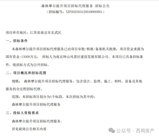 今年3月12日,南京钟山风景区建设发展有限公司发布了森林摩尔提升项目招标代理服务招标公告,公告显示,拟投入13000万元对项目进行提升。