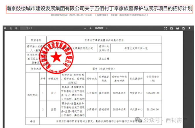 近日,丁奉家族墓保护与展示项目的招标计划发布。据显示,五佰村丁奉家族墓保护与展示项目正在立项中,资金来源为国有(非政府投资),招标人为南京鼓楼城市建设发展集团有限公司,招标标段为设计和监理,合同预估价分别约为185万和58万,预计2025年10月开始招标。