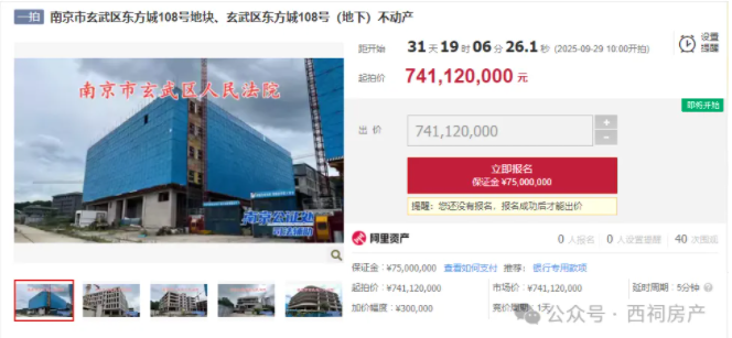 近日,南京市玄武区东方城108号即朗诗绿色中心被挂上某知名法拍网站,案由为借款合同纠纷。该项目起拍价为74112万元,市场价为74112万元,竞拍需缴纳保证金7500万元,增价幅度为30万元,拍卖时间为2025年9月29日10时至2025年9月30日10时止。