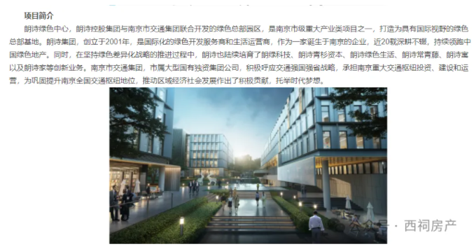 朗诗绿色中心由朗诗控股集团与南京市交通集团联合开发,定位为绿色总部园区,开发主体为南京朗通商业地产运营管理有限公司(以下简称“南京朗通”)。据玄武区政府官网显示,该项目为南京市级重大产业项目,致力于打造具有国际视野的绿色总部基地。