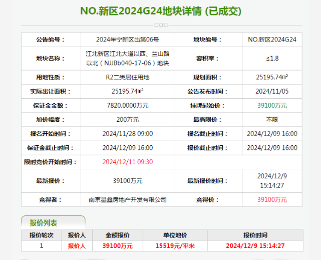 2024年12月11日,该地块被南京星鑫房地产开发有限公司拿下,成交总价3.91亿元,成交楼面价8621元/㎡。天眼查显示,南京星鑫房地产开发有限公司成立于2024年,控股股东为南京新居置地有限公司、江西省建工集团有限责任公司,分别控股51%、49%。
