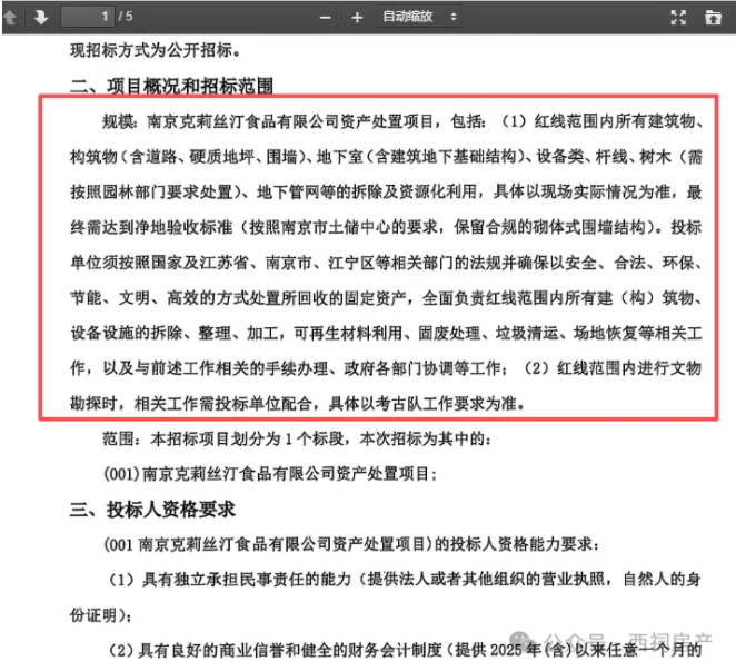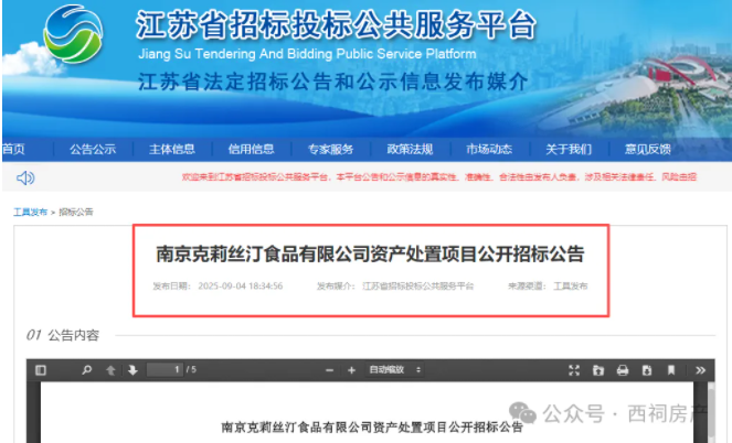 9月4日,据江苏省招标投标公共服务平台消息,南京克莉丝汀食品有限公司资产处置项目公开招标公告发布。本项目己由项目审批/核准/备案机关批准,项目资金来源为其他资金,招标人为南京克莉丝汀食品有限公司管理人,资产处置净得价不低于160.42万元。据悉,该招标项目将对南京克莉丝汀食品有限公司名下的建筑物进行拆除,最终需达到净地验收标准。