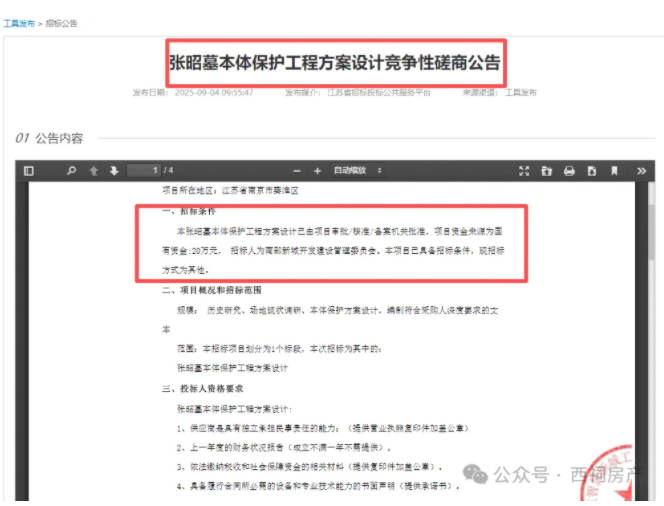 去年11月,南京官宣发现三国重臣张昭墓,引发全国关注。时隔近一年后,9月4日,张昭墓本体保护工程方案设计竞争性磋商公告发布,据显示,张昭墓本体保护工程方案设计已由项目审批/核准/备案机关批准,项目资金来源为国有资金:20万元,招标人为南部新城开发建设管理委员会。
