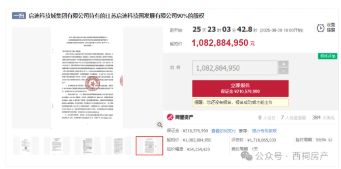 近日,启迪科技城集团有限公司持有的江苏启迪科技园发展有限公司(以下简称“江苏启迪”)90%的股权上架法拍网站,该标的评估价约为17.19亿元,起拍价为10.83亿元,竞拍需缴纳保证金约2.17亿元,增价幅度为5415万元,拍卖时间为2025年9月29日10时至2025年9月30日10时止(延时的除外),截至发稿前,尚无人报名参与竞拍。