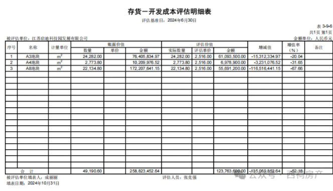 A3、A4、A8地块土地使用,面积合计49,19060㎡,账面值 258,823,452.64 元,评估值合计为 123763600元。