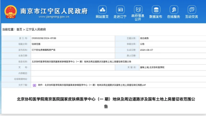 2024年8月7日,项目启动征收前期工作,《北京协和医学院南京医院国家皮肤病医学中心(一 期)地块及周边道路涉及国有土地上房屋征收范围》发布。