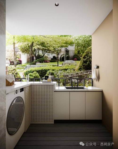 设备平台也能"扩容"!面积约4.5㎡的设备平台空间可联通厨房设计,改造为家政间,放个洗衣机、烘干机全能放下,完美。