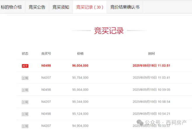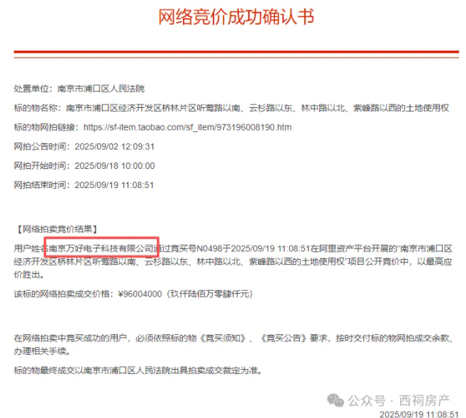 据悉本次拍卖吸引了两位竞拍者参与,30轮竞拍后,被南京万好电子科技有限公司以9600.4万拿下。