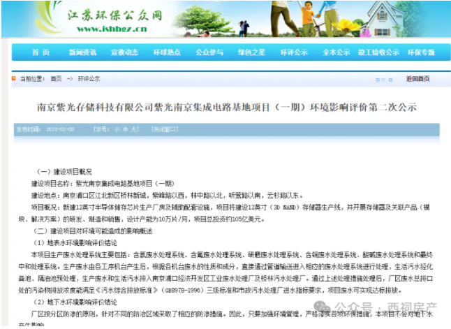 2018年初,项目环评二次公示。同年,“紫光南京集成电路基地项目(一期)”在浦口经济开发区举行开工典礼,计划五年时间建成。