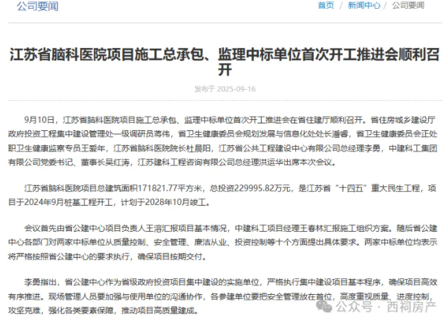 据江苏省公建中心消息,9月10日,江苏省脑科医院项目施工总承包、监理中标单位首次开工推进会在省住建厅顺利召开,据介绍,项目于2024年9月桩基工程开工,计划于2028年10月竣工。