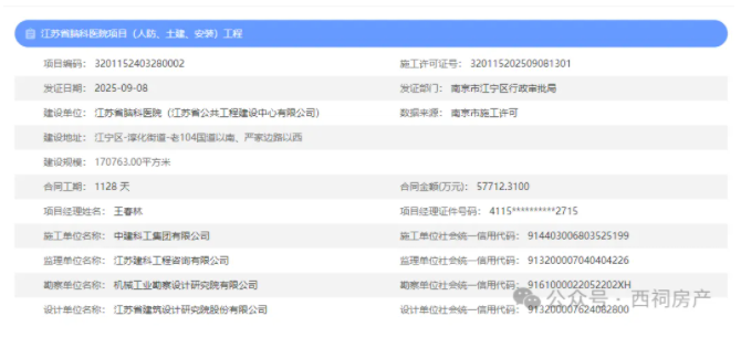 据南京市城乡建设委员会官网消息,9月9日,江苏省脑科医院项目(人防、土建、安装)工程领取施工许可,合同工期为1128天,施工单位为中建科工集团有限公司。
