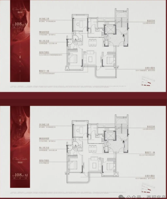 建面约108㎡户型,多功能三房产品,通过四代住宅创新设计,打造出超越面积限制的阔绰空间感,对比市面上大部分同面积户型,省去了过道部分,实现约100%实际空间使用率。除了带有家政间和露台,更是做到了大客厅、大露台、大卧室、大厨房。