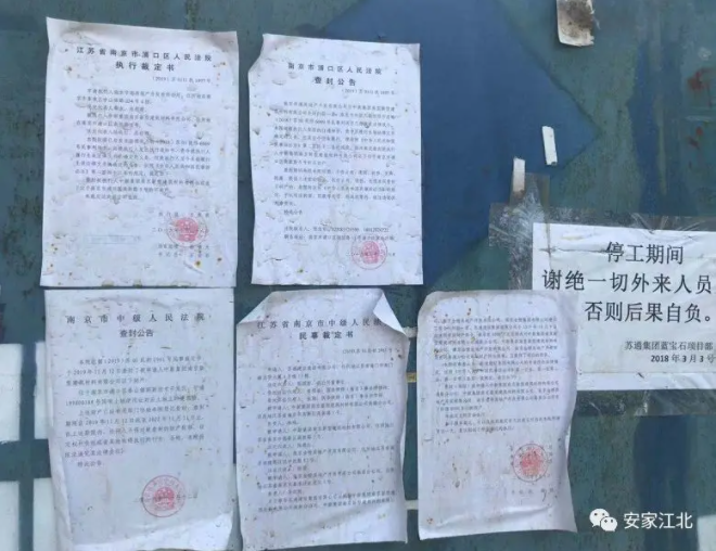 2019年11月,工地大门上出现了一张南京市中级人民法院的查封公告:公告显示:“本院依据(2019)苏01民初2961号民事裁定书,于2019年11月12日查封了被申请人中新集团南京新型建筑材料有限公司以下财产。