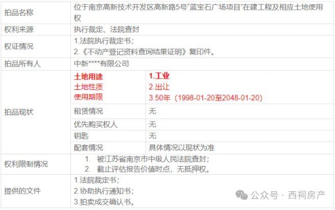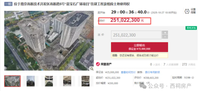 近日,“位于南京高新技术开发区高新路5号“蓝宝石广场项目”在建工程及相应土地使用权”上架法拍网站,据显示,该项目的评估价格为35860.32万元,起拍价格为25102.23万元,相当于打了7折,竞拍需要交纳保证金1500万元,加价幅度为20万元,拍卖时间为2025年10月27日10时至2025年10月28日10时止,截至发稿前,有近300人围观,尚无人报名。