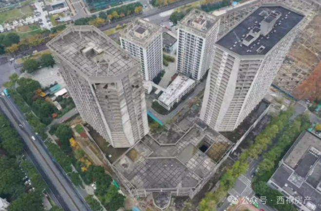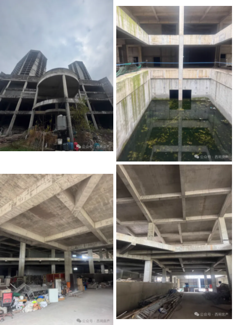 实拍图显示,该项目因长期停工缺乏维护,部分区域出现严重积水,建筑外立面已明显发黑并滋生大面积霉斑。