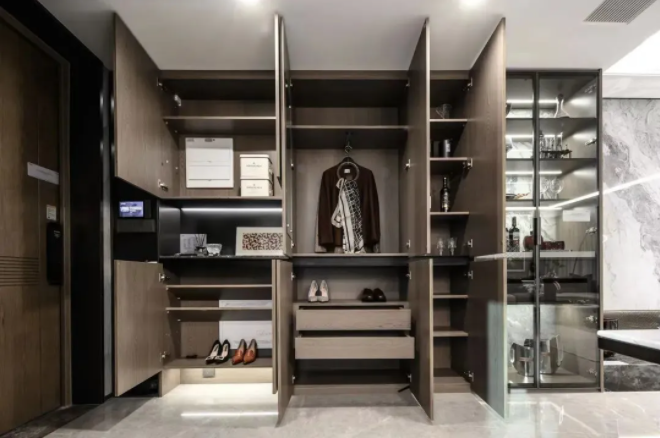 项目对居家收纳进行了深入考量,以“不浪费每一平方米”的极致理念,系统性地规划了全屋收纳体系。从入户开始,便精心设计了一体化的玄关柜、餐边柜等大量定制收纳柜体,旨在高效利用每一处空间,甚至巧妙提升了那些原本利用率不高的角落。例如,其135㎡户型更配备了约10米超长跑道阳台和餐客厅一体化设计+岛台,在扩大空间感的同时,也融入了实用的收纳功能。
