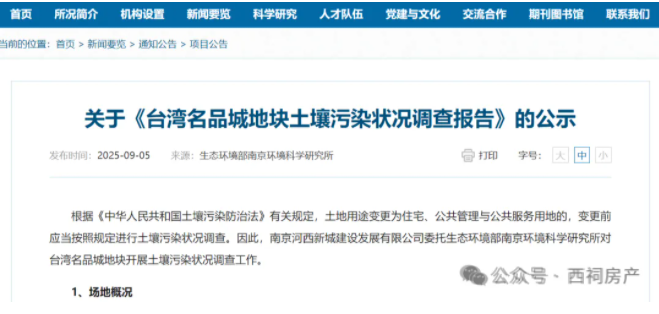 9月5日,官方发布了关于《台湾名品城地块土壤污染状况调查报告》的公示,内容显示:本项目调查地块台湾名品城地块(二类居住用地和商办混合用地),当前和历史上均不存在明确的可造成土壤污染的污染源,按照《建设用地土壤污染状况调查技术导则》(HJ25.1-2019)等相关国家技术标准和规范要求,该地块不需启动第二阶段采样调查。该地块不属于污染地块,满足地块后期规划建设要求。