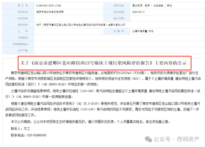 地块为原南京缸套总厂部分生产用地。今年3月,官方公示了关于《南京市建邺区苍山路以西13号地块土壤污染风险评估报告》主要内容,据悉,该地块土壤中石油烃(C10-C40)等污染物的风险不可接受,需针对风险不可接受区域的土壤,实施下一步修复或风险管控工作。