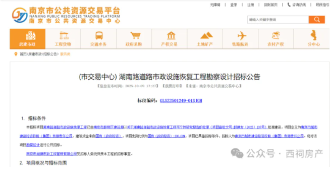 10月9日,湖南路道路市政设施恢复工程勘察设计招标公告发布。据显示,本招标项目湖南路道路市政设施恢复工程已由南京市鼓楼区建设局以关于湖南路道路市政设施恢复工程可行性研究报告的批复(项目审批文号:鼓建发〔2025〕137号)批准建设,建设资金来自国有(政府投资),项目出资比例为国有(政府投资):100.00%,招标人为南京市城市建设投资控股(集团)有限责任公司。