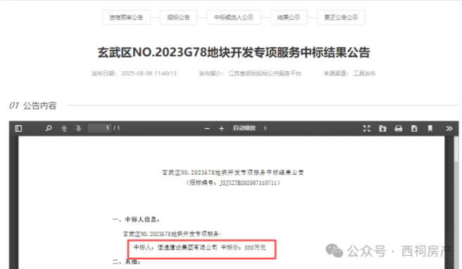 2023年12月14日,该地块被南京玄武安居绿色建设发展有限公司以底价1.6亿元拿下,成交楼面价14191元/㎡。