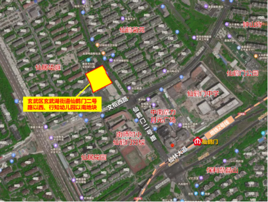 该项目为城东仙鹤门片区近十年来首次推出的稀缺住宅用地,地块周边配套成熟,仙鹤门新天地商业广场、中南魔力月光商业广场、学则路商业圈提供有完善的商业配套,地块北侧为行知路幼儿园。该片区上一次住宅用地出让早在2014年,全国知名家电巨头奥克斯击败了万科、保利、朗诗、雨润等房企,以总价16.6亿拿下仙鹤门G30地块(钟山府),楼面地价12022元/㎡。