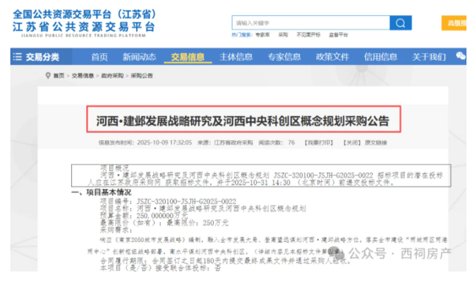 10月9日,河西·建邺发展战略研究及河西中央科创区概念规划采购公告发布。该研究为响应《南京2050城市发展战略》编制,融入全市发展大局、登高望远谋划河西·建邺战略方位。落实全市建设“两城两区两港两中心”创新枢纽战略部署,高水平谋划河西中央科创区。