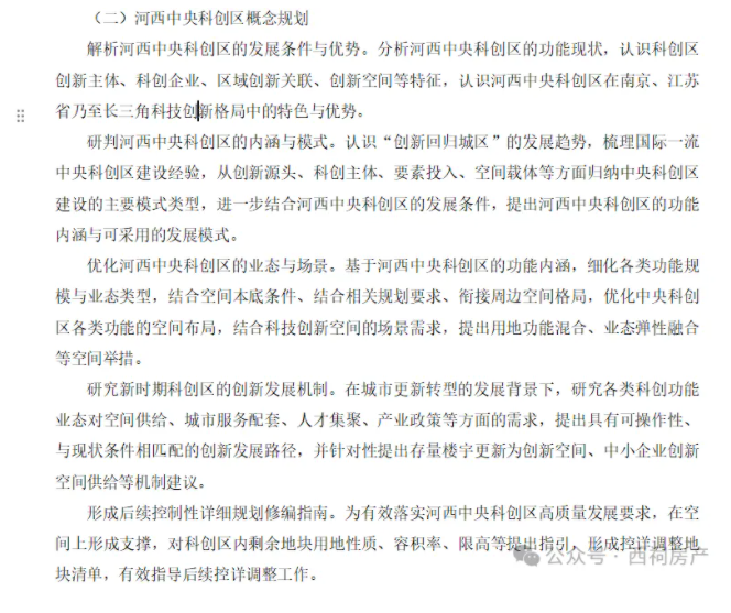3、优化河西中央科创区的业态与场景。基于河西中央科创区的功能内涵,细化各类功能规模与业态类型,结合空间本底条件、结合相关规划要求、衔接周边空间格局,优化中央科创区各类功能的空间布局,结合科技创新空间的场景需求,提出用地功能混合、业态弹性融合等空间举措。