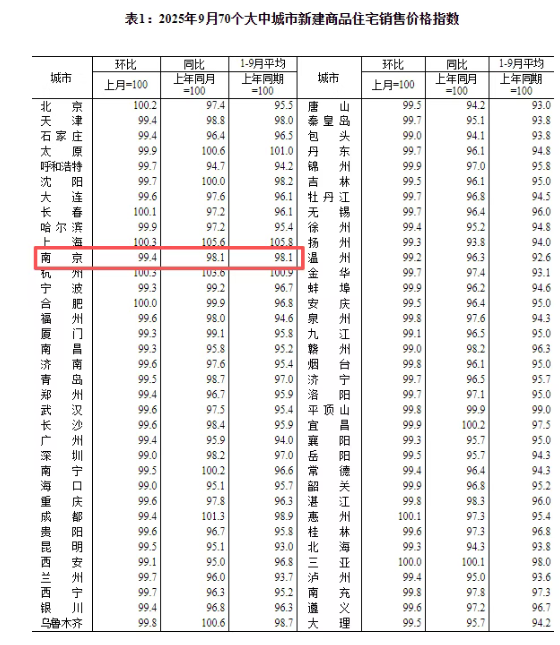 10月20日,国家统计局发布2025年9月全国70城住宅销售价格报告。9月南京新房价格环比下跌0.6%,同比下跌1.9%;二手房价格环比下跌0.8%,同比下跌5.9%。