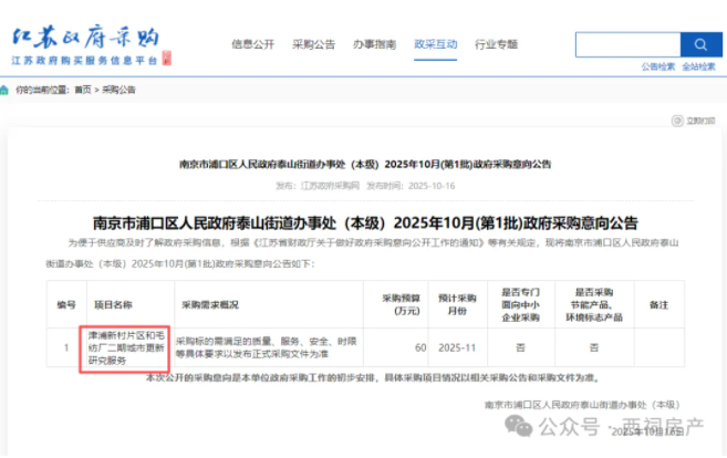 10月16日,据江苏政府采购网显示,南京市浦口区人民政府泰山街道办事处发布2025年10月(第1批)政府采购意向公告,项目名称为津浦新村片区和毛纺厂二期城市更新研究服务,采购预算为60万元,预计采购月份为2025年11月。