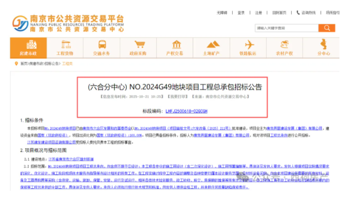 10月21日,NO.2024G49地块项目总承包招标公告发布。据悉,该项目已由南京市六合区发展和改革委员会以NO.2024G49地块项目(项目审批文号:六发改备〔2025〕211号)批准建设,项目业主为南京邑居建设发展(集团)有限公司,建设资金来自国有(非政府投资),项目出资比例为国有(非政府投资):100.00%,计划工期为1080日历天, 合同估算价为400000000元。