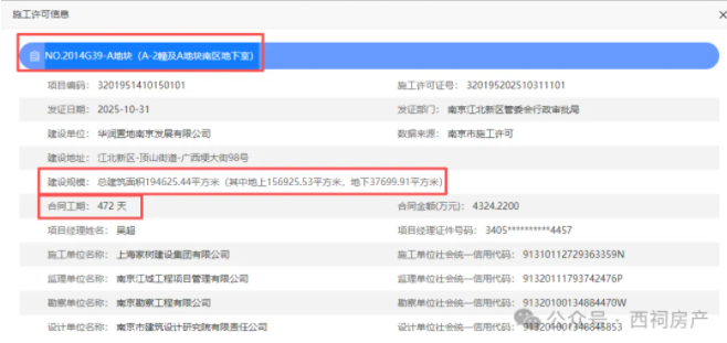 10月31日,据南京市建委官网显示,NO.2014G39-A地块(A-2幢及A地块南区地下室)施工许可获批,总建筑面积194625.44平方米(其中地上156925.53平方米,地下37699.91平方米),合同金额为4324万元,合同工期为472天,建设单位为华润置地南京发展有限公司。