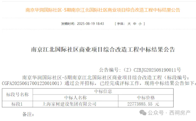 今年1月,华润招标官网发布了《南京浦口国社项目AB地块二期建筑概念至建筑扩初设计》。7月,《南京江北国际社区商业项目综合改造工程》招标公告发布,计划今年8月进场(实际9月1日进场),工期416天。