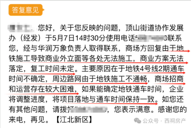 2024年5月,官方曾表示,江核华润万象系商业停工“主要原因在于地铁4号线2期通车时间不确定,周边路网由于地铁施工不通畅,商场招商和运营存在较大困难,如果能确定地铁通车时间,企业将调整进度,将项目落地与通车时间保持一致。”