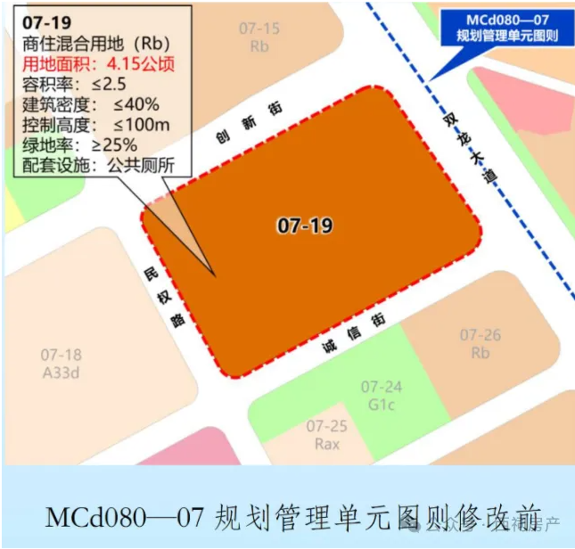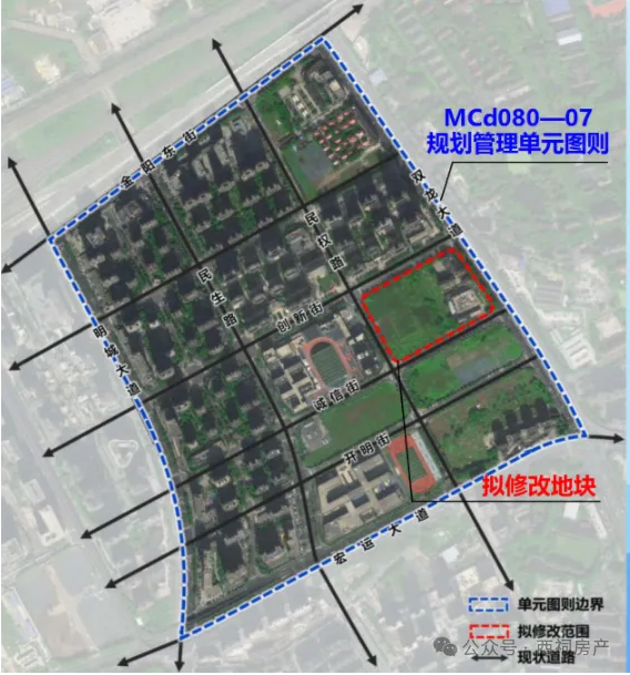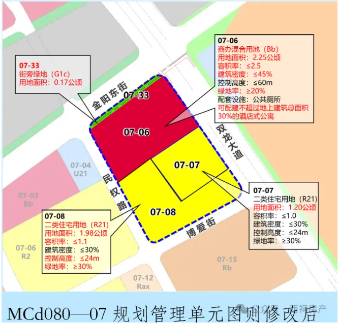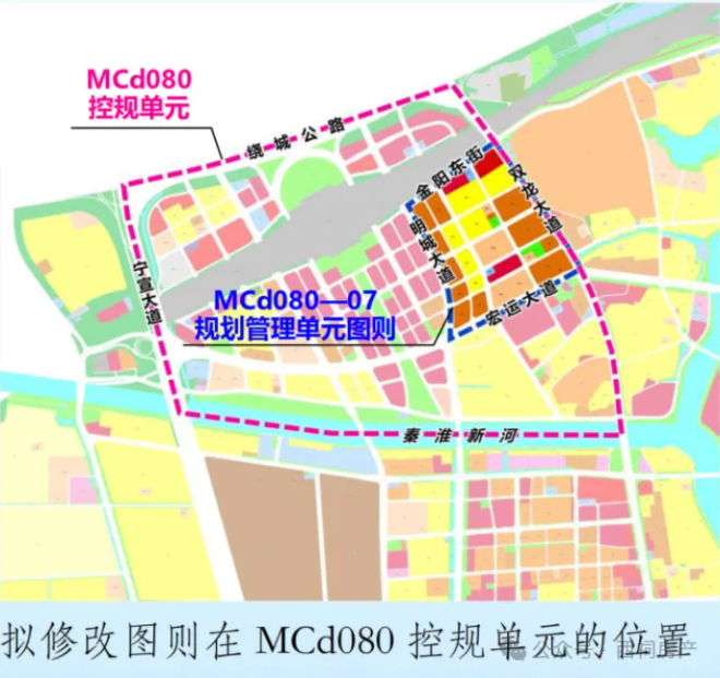 MCd080-07规划管理单元图则位于铁路南站片区东侧,东至双龙大道、南至宏运大道、西至明城大道、北至金阳东街,用地面积约84.52公顷。