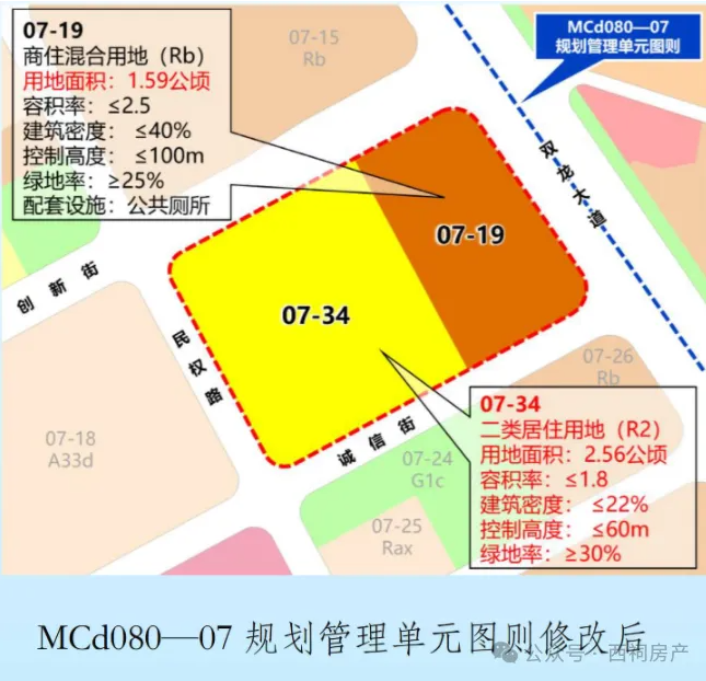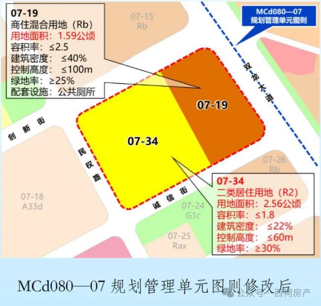 将地块划分为东西两幅用地,其中东侧 07-19商住混合用地(Rb)用地面积约1.59 公顷,其余指标保持不变;西侧 07-34用地面积约2.56公顷,用地性质由商住混合用地(Rb)调整为二类居住用地(R2),容积率≤1.8,建筑密度为≤22%,建筑高度≤60 米,绿地率≥30%。