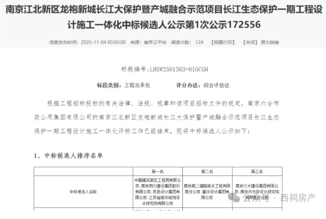 11月4日,南京江北新区龙袍新城长江大保护暨产城融合示范项目长江生态保护一期工程设计施工一体化中标候选人公示新鲜出炉。据显示,中标候选人名称为中国建筑第五工程局有限公司、南京同力建设集团股份有限公司、苏邑设计集团有限公司、江苏省城市规划设计研究院有限公司,投标报价(元)为114444158.68元,工期为540日历天。