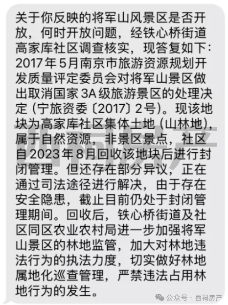 11月5日,铁心桥街道高家库社区回复:“2017年5月南京市旅游资源规划开发质量评定委员会对将军山景区做出取消国家3A级旅游景区的处理决定(宁旅资委(2017〕2号)。现该地块为高家库社区集体土地(山林地)属于自然资源,非景区景点,社区自2023年8月回收该地块后进行封闭管理。但还存在部分异议,正在通过司法途径进行解决,由于存在安全隐患,截止目前仍处于封闭管理期间。回收后,铁心桥街道及社区同区农业农村局进一步加强将军山景区的林地监管,加大对林地违法行为的执法力度,切实做好林地属地化巡查管理,严禁违法占用林地行为的发生。”