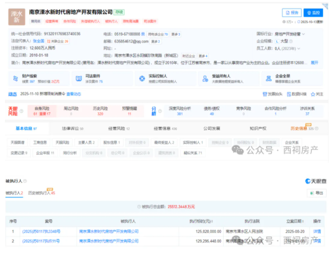 溧水新时代还有合作风险,官司缠身,被列为失信被执行人、限制高消费,被执行金额约2.55亿元。