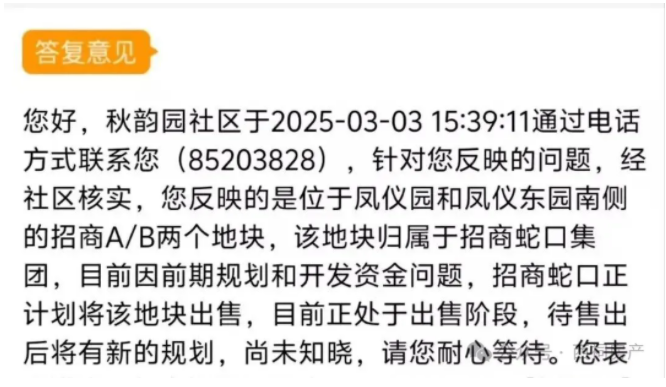 2025年3月,有网友向官方咨询“丁家庄商业综合体是否还建”,官方当时答复为:“经社区核实,您反映的是位于凤仪园和凤仪东园南侧的招商A/B两个地块,该地块归属于招商蛇口集团,目前因前期规划和开发资金问题,招商蛇口正计划将该地块出售,目前正处于出售阶段,待售出后将有新的规划,尚未知晓,请您耐心等待。”