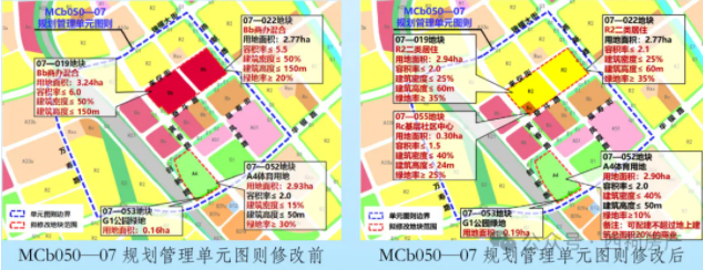 其中07-019地块用地性质由商办混合用地(Bb)调整为二类居住用地(R2),容积率由≤6.0调整为≤2.0,建筑高度由≤150米调整为≤60米,建筑密度由<50%调整为≤25%,绿地率调整为≥35%;