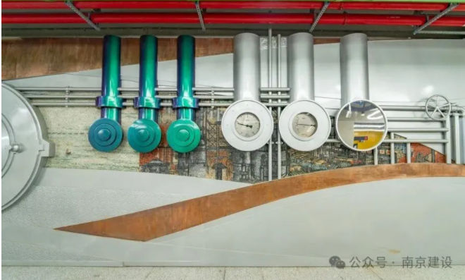 金陵石化站以南京首座工业风主题车站。这里没有传统地铁的封闭吊顶,蓝绿色圆形风管与红色消防管道在灰色清水混凝土顶面上整齐排布,与明黄色墙面形成强烈色彩碰撞,工业质感与科技感扑面而来。