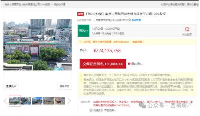 本次拍卖起拍价为253876830元,竞拍需缴纳保证金30,000,000元,最低增价幅度为50000元/次。此次拍卖,比去年起拍价2.9亿元,降了约4000万。>>>一声叹息!南京市中心80年老商场,2.9亿元抛售…