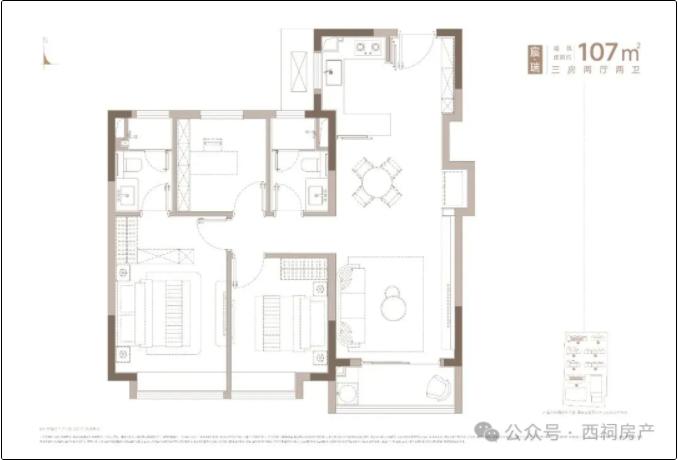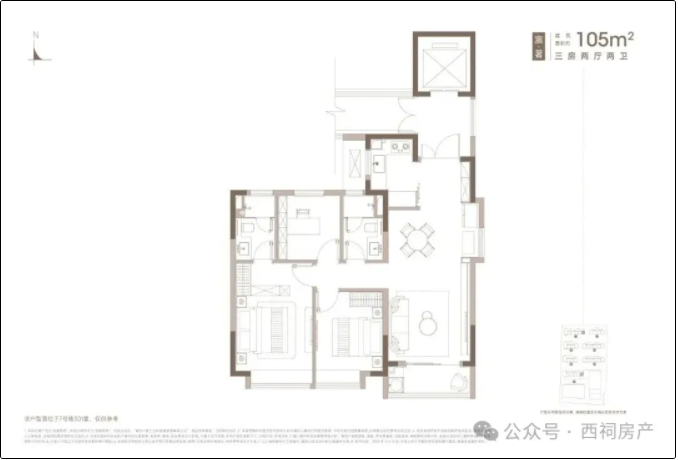 目前主推的建面约 105、107㎡三房两卫,是主城少有的紧凑又实用的户型!