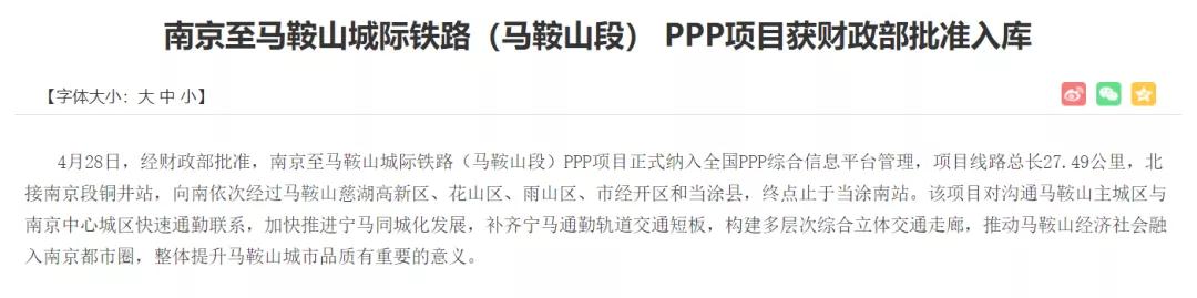 最近,宁马线马鞍山段迎来新进展。6月8日,南京至马鞍山城际铁路(马鞍山段)PPP项目招标公告正式发布。共计花费29.35亿,其中政府出资15%,中标社会资本出资85%。