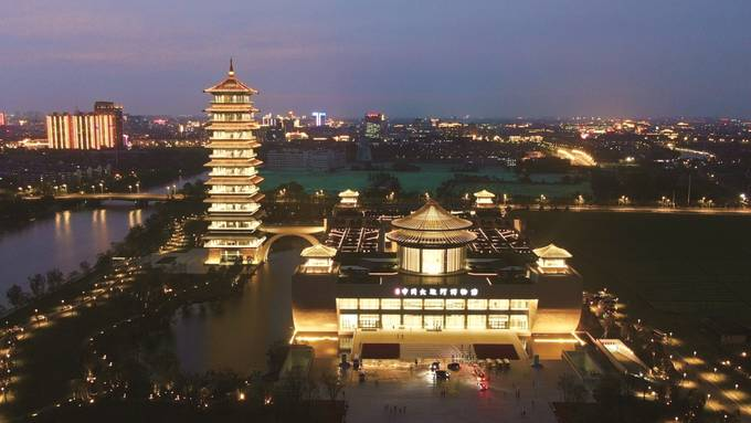 扬州中国大运河博物馆华灯璀璨,与三湾生态湿地景观交相辉映。