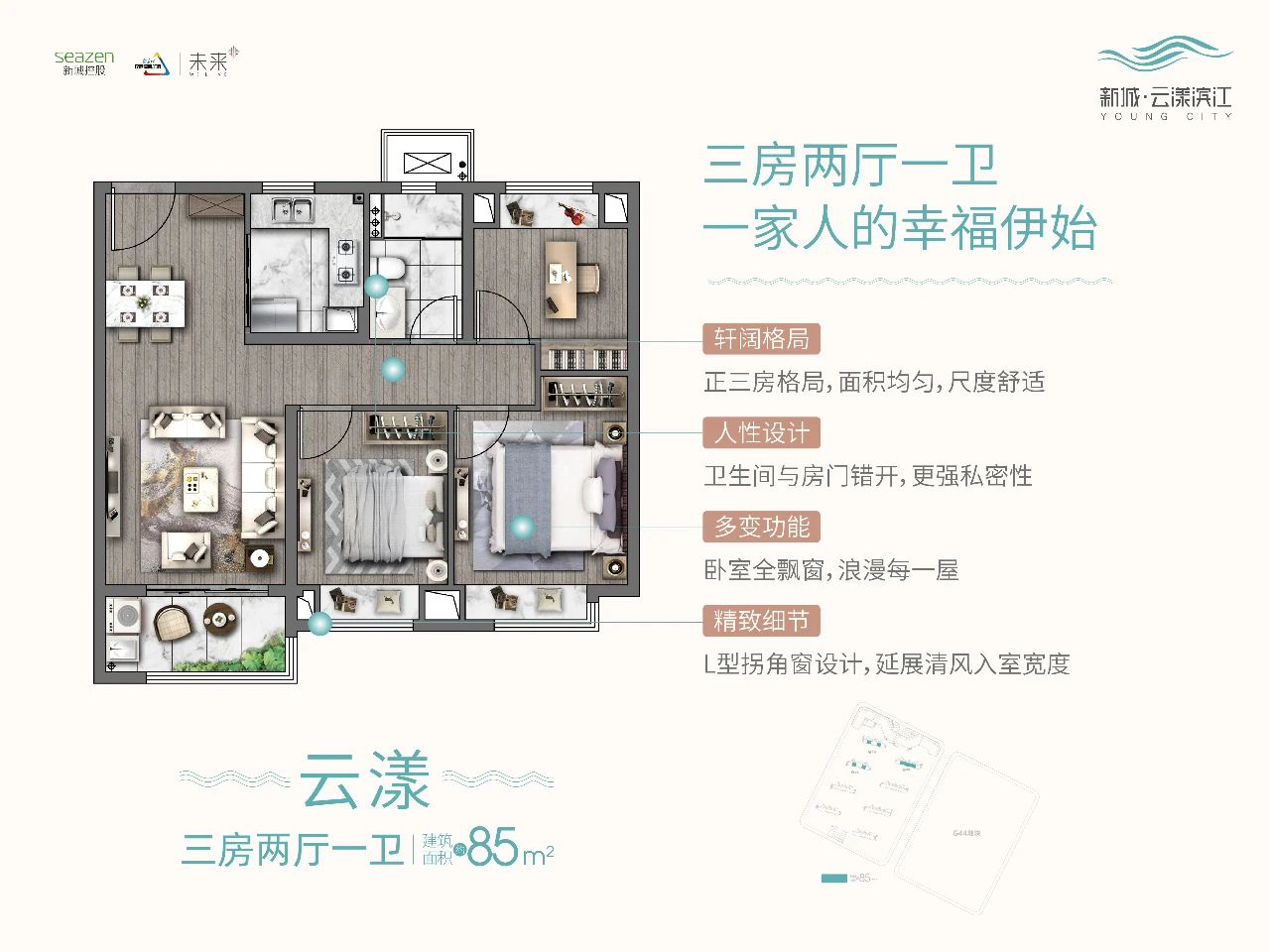 在户型设计上,新城云漾滨江也是独具匠心,打造了建筑面积建面约75、85、100、125㎡四种户型,满足购房者不同置业的需求。而且项目户型方正,南北通透,通风采光良好;分区明确,合理布局。