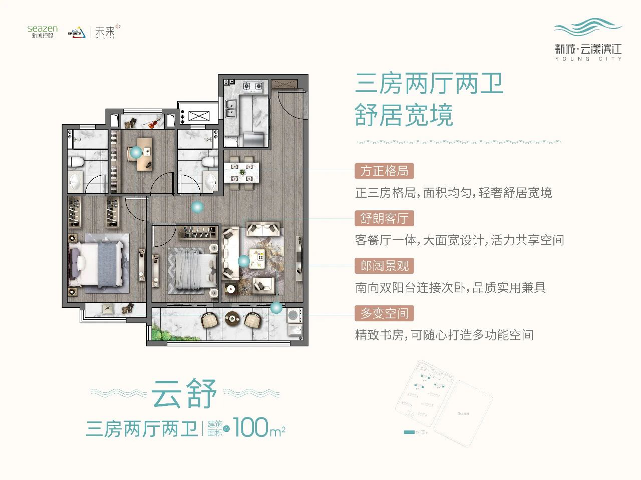 建面约100㎡户型三室两厅两卫设计,三开间朝南,罕见景观双阳台、超大面宽采光;主为套房设计,兼具舒适性与私密性。