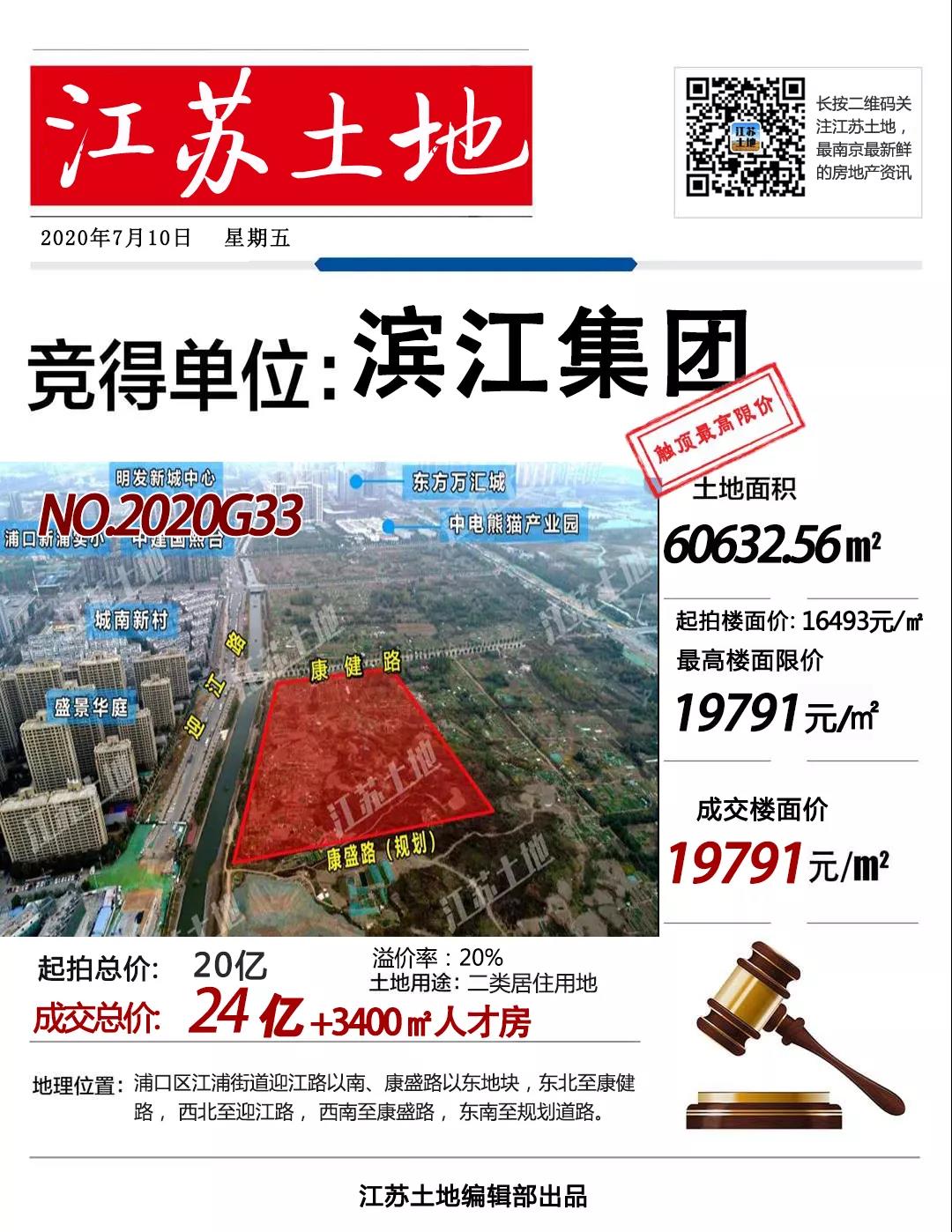 滨江嘉品前身为江浦G33地块,经58轮竞价,滨江集团以总价24亿+人才房3400㎡竞得,成交楼面价19791元/㎡,溢价率20%。