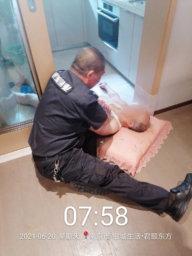 时间回到6月20日早上7:40左右,君颐东方芳泽园8幢一位男业主到厨房倒水,突然昏倒在厨房,玻璃杯碎了,当时呼吸急促。女业主在睡觉,突然听到玻璃破碎的声音,到客厅查看,发现男业主昏倒在厨房,不动且没有气息,赶紧站在阳台窗户处呼救。