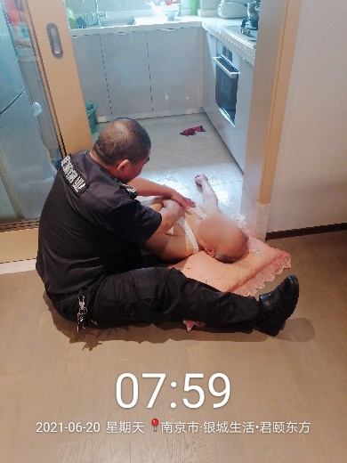 安护队员蒋宗武园区巡逻,听到女业主的呼救,立即飞奔到业主家,咨询女业主,问昏倒的业主有没有心脏病之类的基础疾病,查看现场情况报120,并马上对业主实施心肺复苏急救。大约15分钟后业主慢慢恢复意识,身体在轻微的扭动,蒋宗武第一反应想到的业主身体下面是不是有异物,赶紧给业主翻身,发现身体下面有少许碎玻璃渣,赶紧和热心赶到的邻居清理干净,安护队员蒋宗武又继续给业主做心肺复苏,直到救护车到达为止。